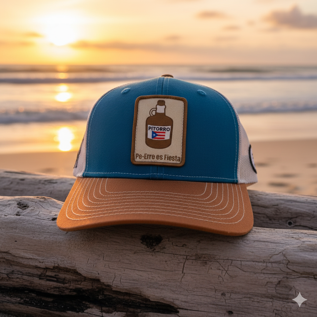 The Pitorro trucker is for the ones who turn up the volume and light up every parranda. Metallic and deep tones inspired by Puerto Rico’s homemade holiday spirit — bold, rebellious, and 100% street.